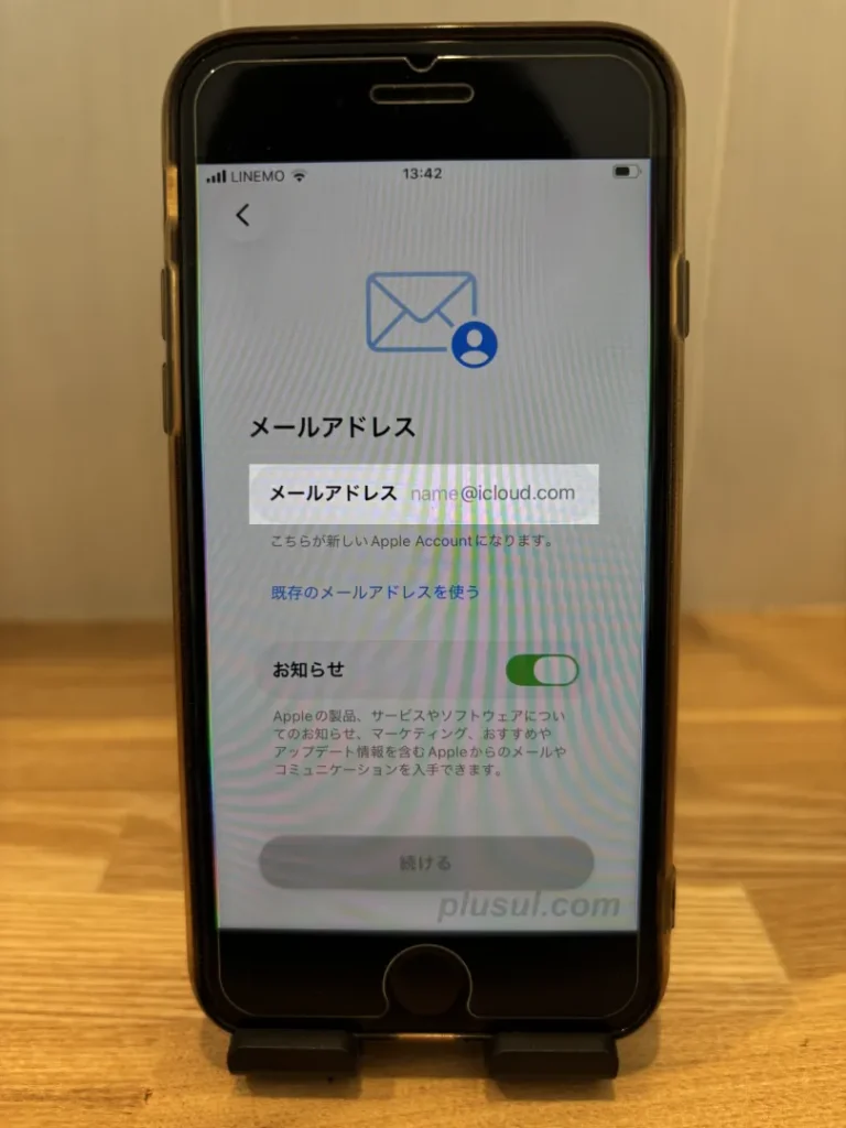 「@icloud.com」より前の部分が入力できるようになるので、希望のアドレスを入力して[続ける]>[メールアドレスを作成]の順にタップして進めましょう。そのままパスワードも決めて、入力が終わったら[続ける]をタップします。