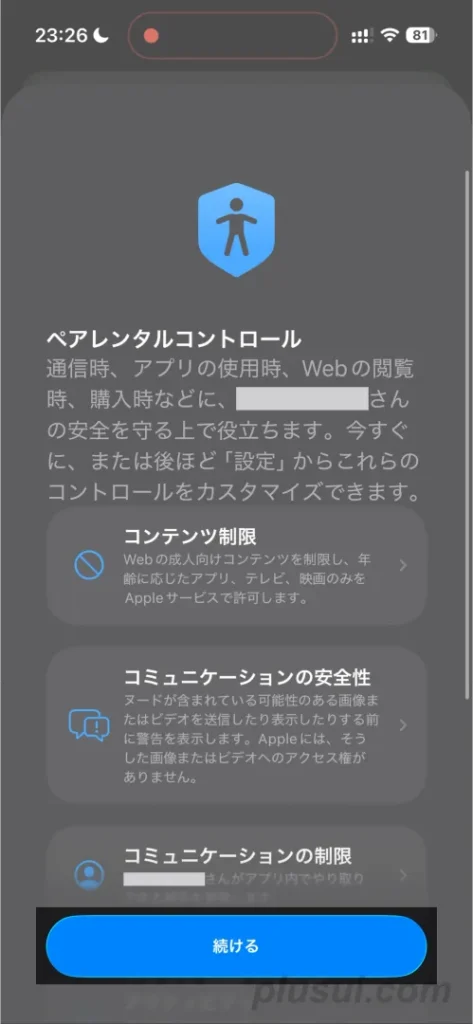 次に、ペアレンタルコントロールの設定(スクリーンタイム機能を利用した見守り設定)が表示されます。