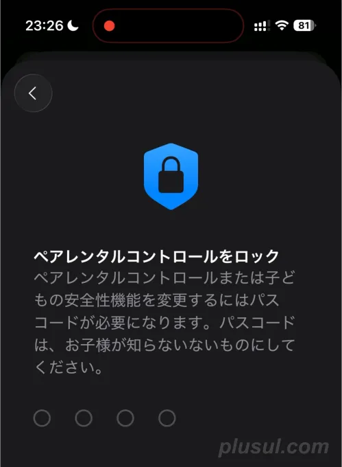 続いて、ペアレンタルコントロールをロックするパスコードを任意の4桁の数字で入力します。このパスコードで、お子さんのiPhoneに設定した制限を解除できてしまうので、必ず保護者だけで管理するようにしてください。